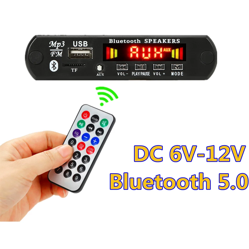 Tips: Please pay attention to the voltage requirements and the position of the positive and negative poles of the power supply when buying and using this product to avoid burnout. Characteristic:1. Support mp3 / wma / WAV / FLAC / ape;2. Support Bluetooth 5.0;3. Digital tube display;4. Support USB / TF (SD) / Bluetooth / FM / aux and other modes;5. Power off memory function;6. Support folder playing;7. Support 5-10m far infrared remote control operation;8. Support external audio input line input (aux);9. Support radio frequency modulation, receiving frequency band (87.5mhz- 108.0mhz);10. Button: four button multi direction control, vol - / Auto / vol + / mode;Operation details:1.Vol - (previous song / volume reduction): in MP3 mode, short press of vol is the previous song and long press is volume reduction; in FM mode, short press can adjust a radio station number; in Bluetooth mode, short press is the last song of Bluetooth and long press is volume reduction.2. Automatic (play / pause): in MP3 state, short press Auto to play / pause; in FM state, short press to play / pause, long press to receive and save automatically; in Bluetooth function, short press to play / pause.3. Vol + (next song / volume increase): in MP3 mode, short press one song and long press to increase the volume; in FM mode, short press to adjust the radio number; in Bluetooth mode, short press to next song and long press to decrease the volume.4. Mode: USB / TF (SD) / FM / Aux / Bluetooth function switchingPackage content:1 *MP3 decoder board1 *remote control (no battery, no retail package)