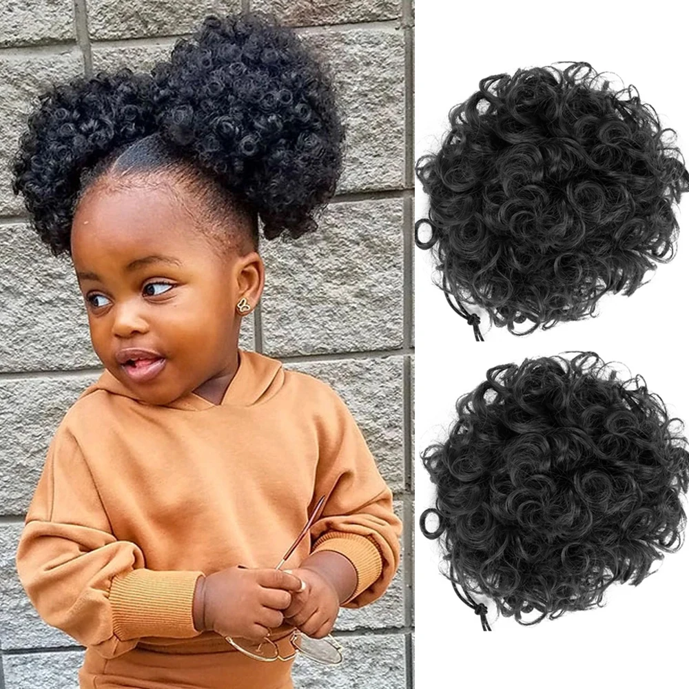 2Pcs Synthetic Afro Kinky Hair Bun Chignon Postiche Cheveux High Temperature Fiber Drawstring Ponytail on Puff Hair Bun For Kids