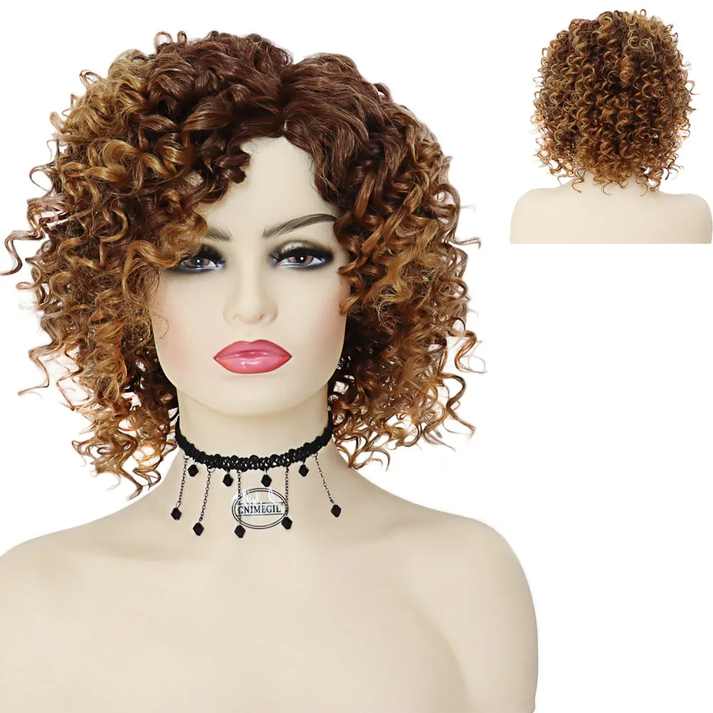 GNIMEGIL Synthetic Wig Female Brown Hair Ombre Wig with Bangs for Women Short Wave Bob Wig Pelucas Afro Curly Wig Natural 10 inches Soft as Human Hair, Fluffy Hair Replacement Wigs for Black Women❤️[Natural Hairstyles]- Natural Afro Curly Hair Wig for Black Woman Come with Free Wig Cap x 1 + 2pcs Tattoo stickers❤️[Hair Material]- Heat resistant hair tinsel that holds up to styling tools providing a similar styling versatility as with human hair. The wig can also be customized to suit your own individual look by cutting them or using a curling iron/hair straightener. (Note: optimal temperature is 250-275 degrees, but going above 350 degrees is not recommended.)❤️[Occasions]- Fashionable and stylish wigs look natural, real like human hair wigs, very pretty, and feminine, soft touch. You can wear it for parties, Halloween, cosplay, daily use, gift sending to friends and certain themed performances, fashion and attractive, adding more charm and fun.❤️[Adjustable Size]- Mesh size fits for head circumference 20-22.5 inches, There are two adjustment straps inside the wig, which can be intertwined to a fixed position to suit different head sizes. ❤️[Worry-free After-sales]- We Are Committed To Providing Customers with Quality Products and Attentive Services, Full Refunds and Returns If You Don't Like it.